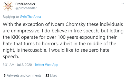 The subsequent reaction to both pieces on social media has been varied, from enthusiastic agreement, to cynical scepticism, to absolute outrage. Those who agree ultimately laud the right to freedom of speech from all sides of the political spectrum, with the inclusion of Chomsky particularly notable in this instance; he himself notes his experiences with his books being withdrawn from publication, or destroyed, due to their contents, as well as the forced elimination of faculty positions of those around him.